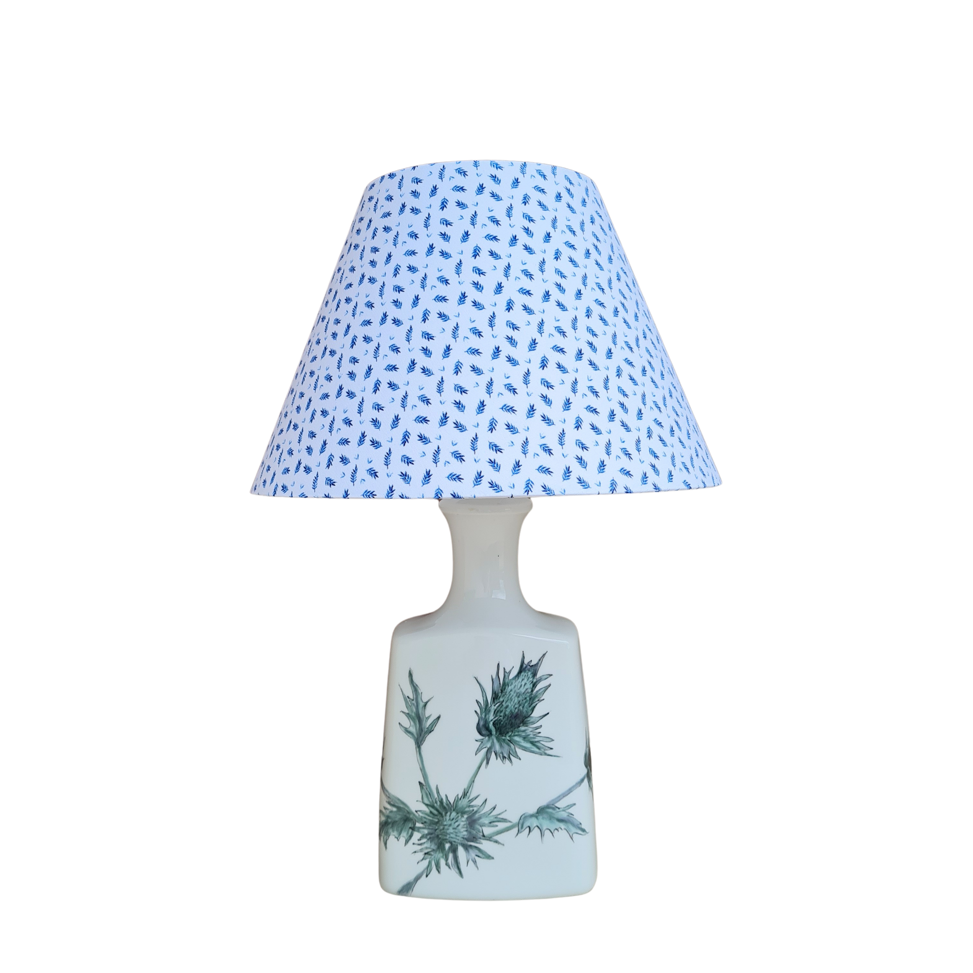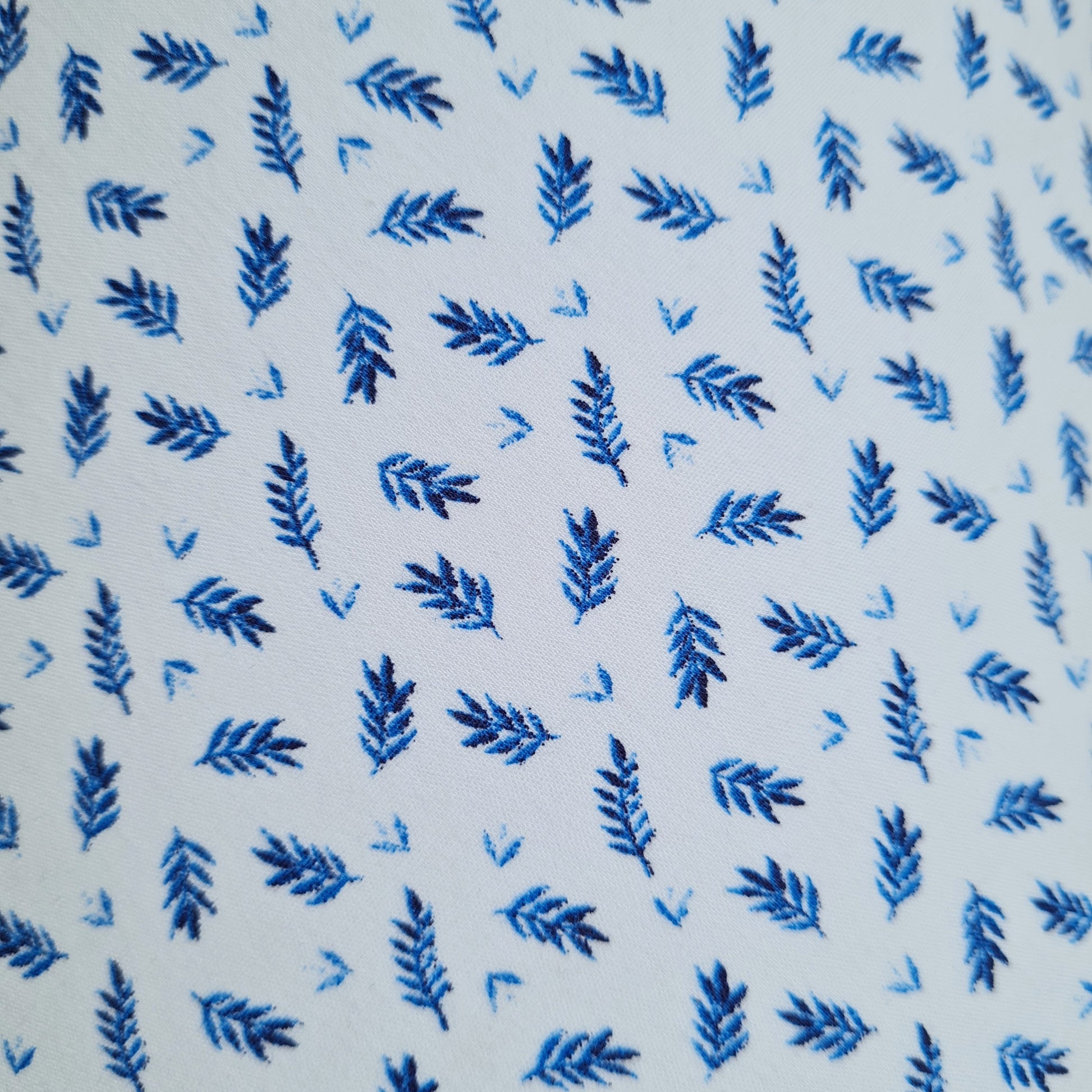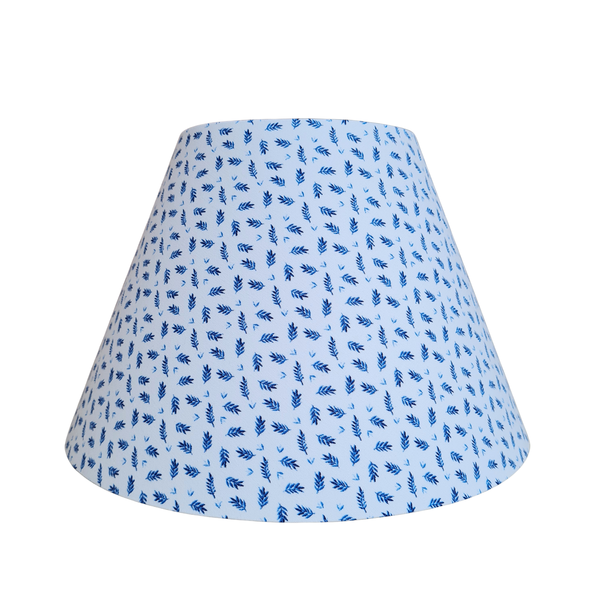 Håndlavet lampeskærm i mønstret bomuld med smukke ensartede blade i blå på hvid baggrund