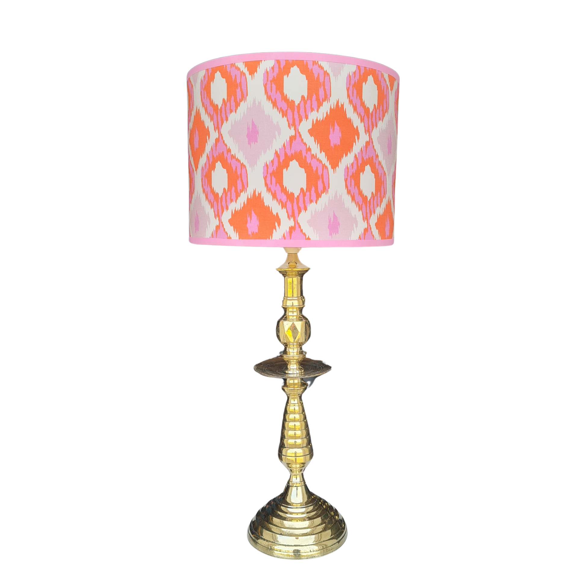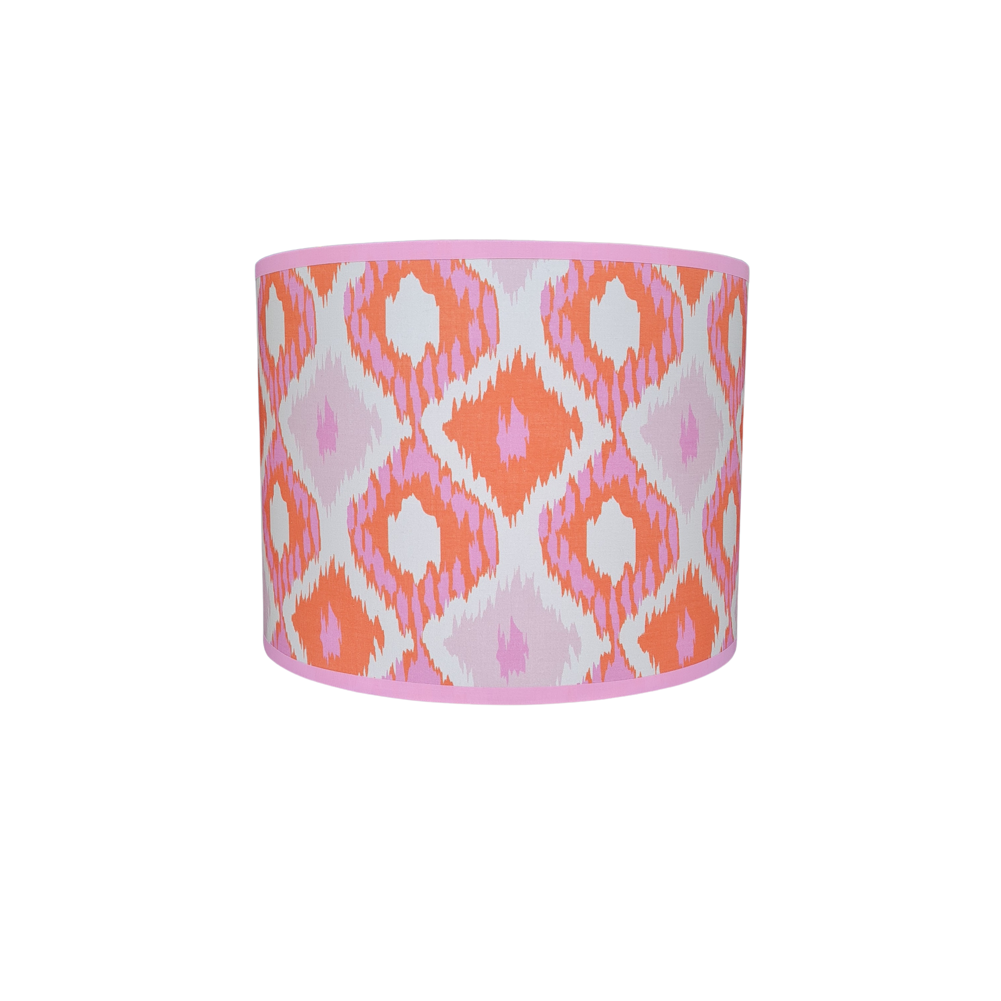 Denne smukke lampeskærm er håndlavet i ikat bomuld i smukke nuancer af orange/pink/lyserød og er afsluttet med en eksklusiv detalje af fine kantbånd i lys pink