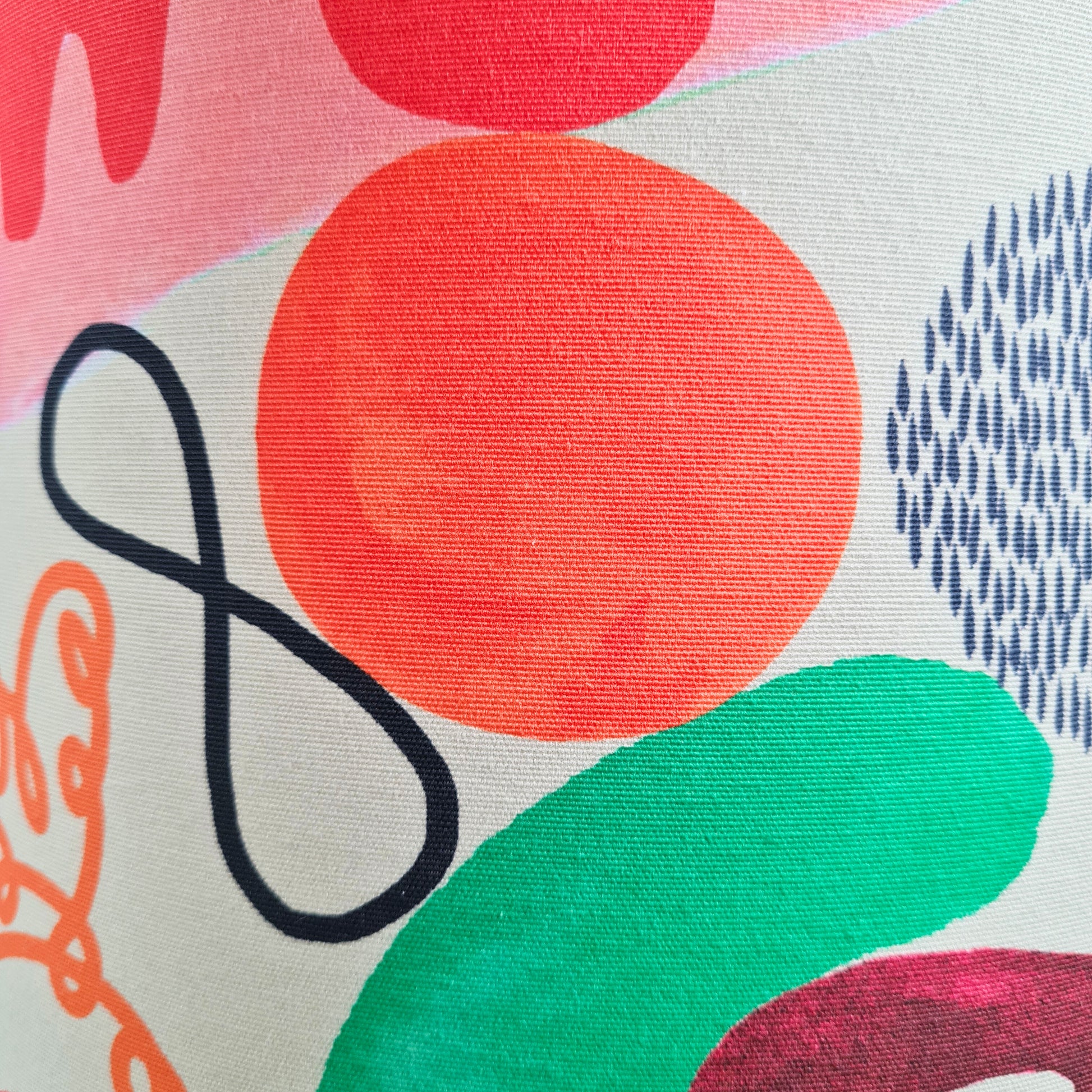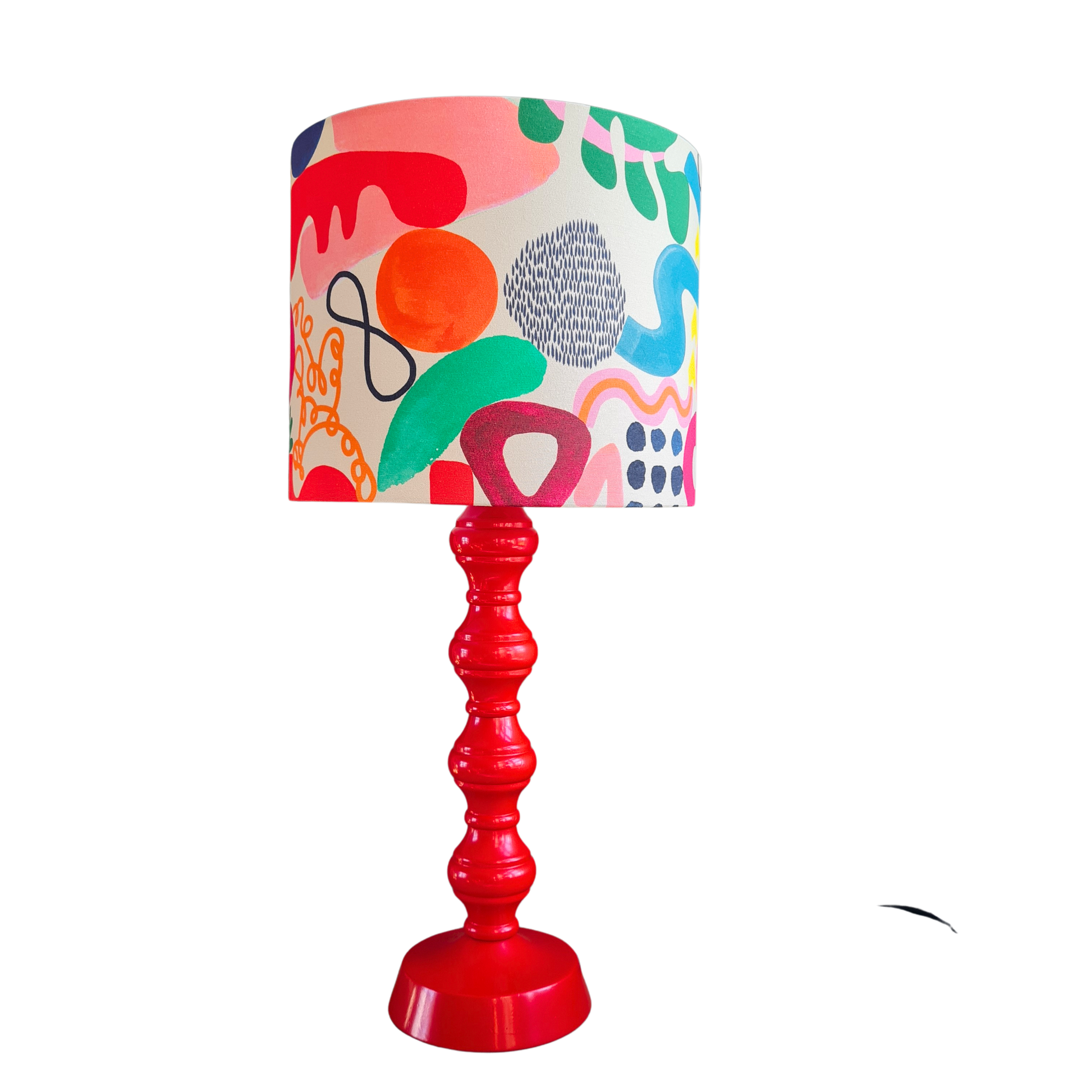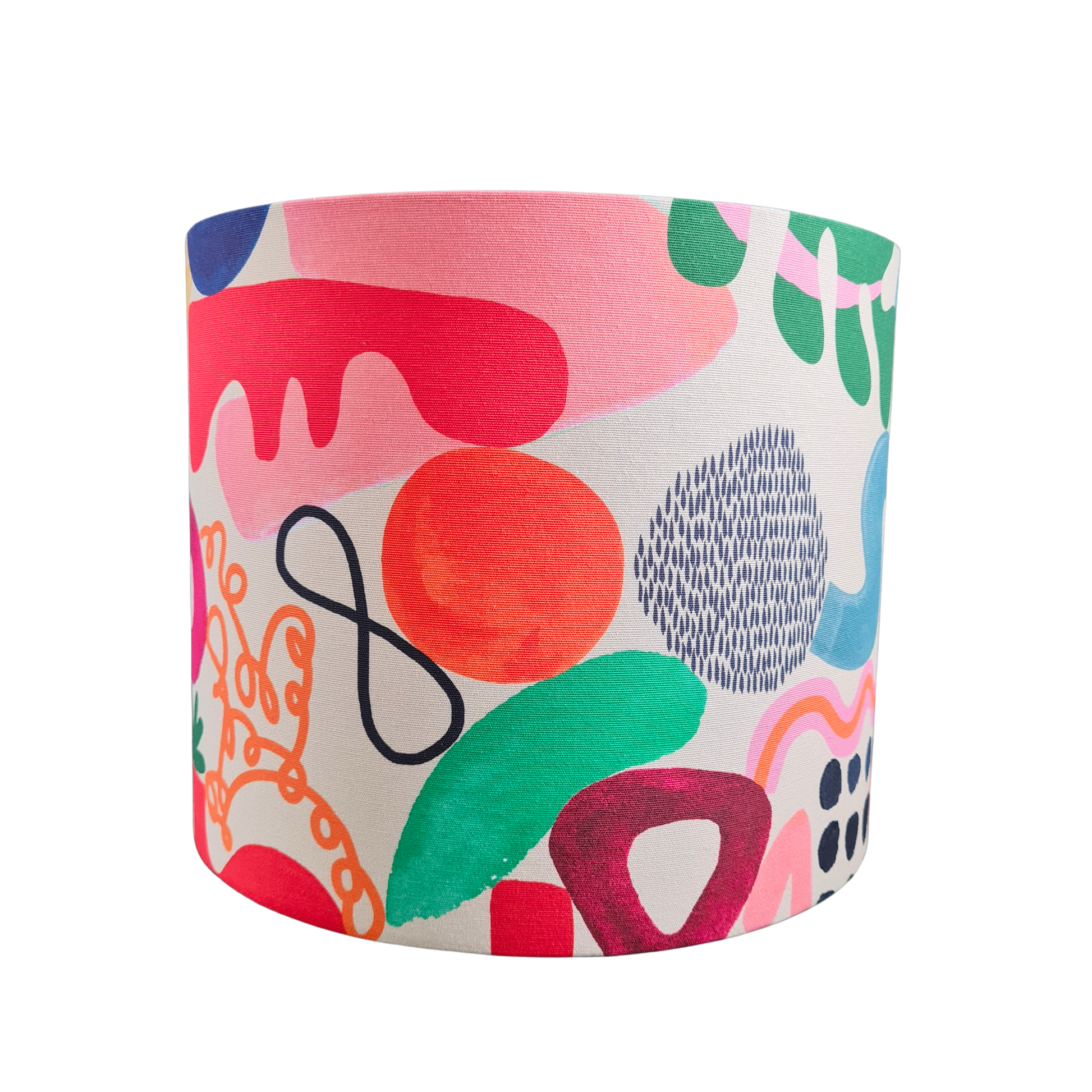 Håndlavet lampeskærm i bomuld med flot og farverigt mønster med organiske former Et mønster som er meget velegnet til lidt større lampeskærme, både på bordlamper og som loftlampe