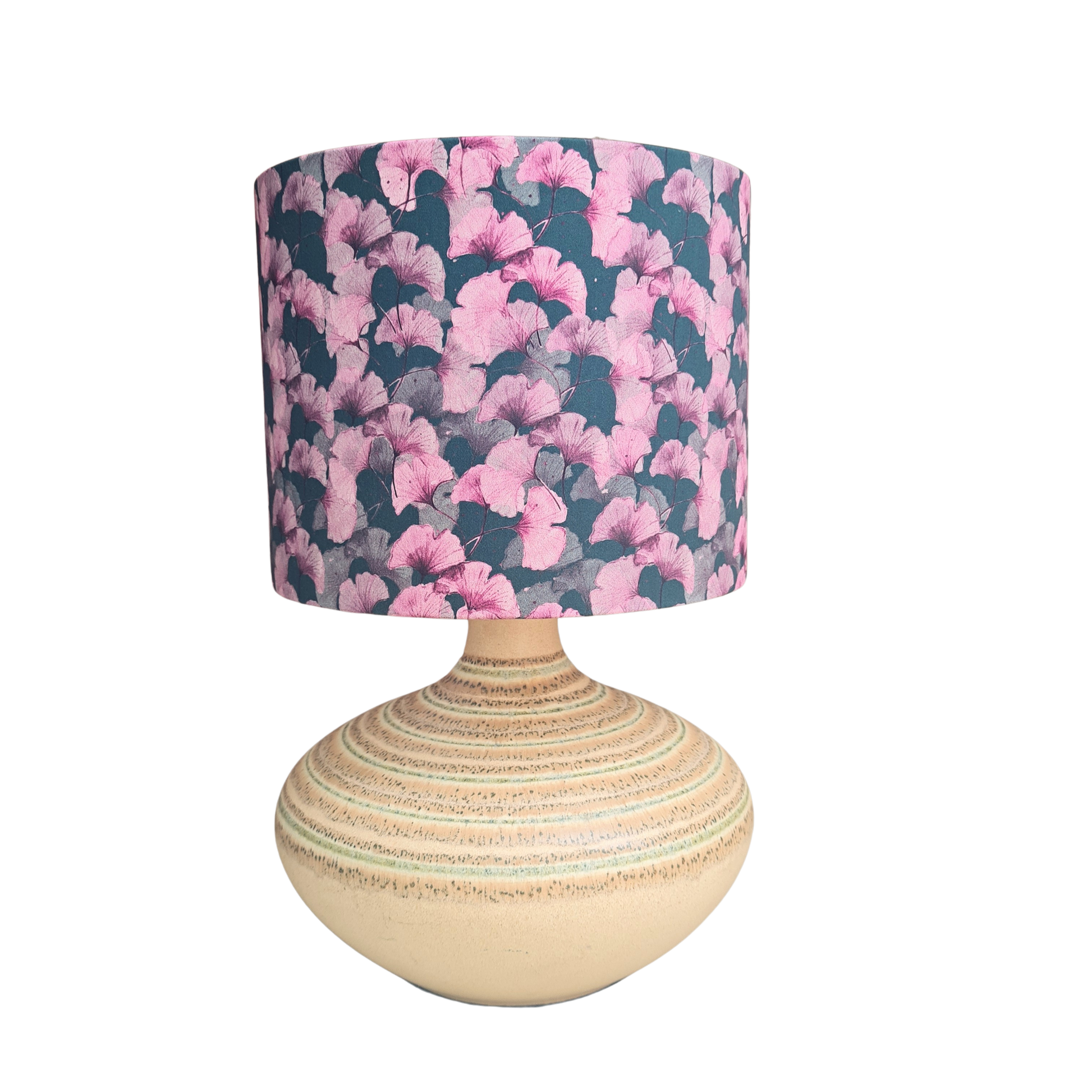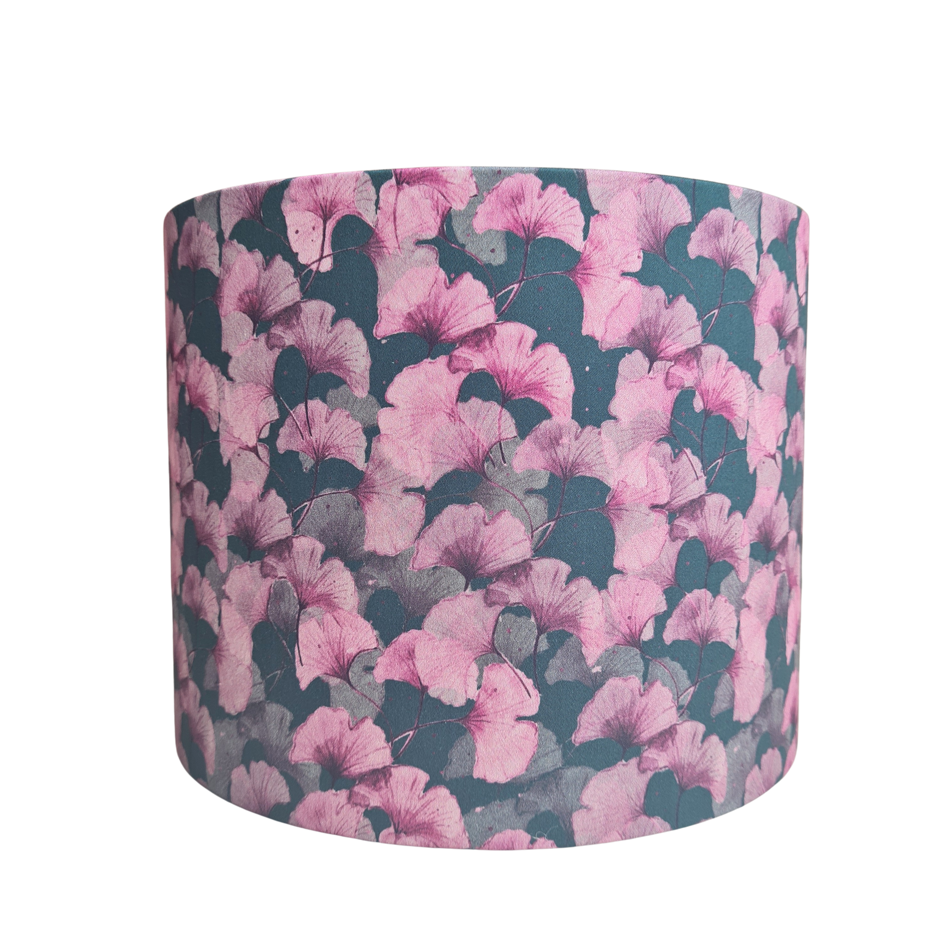 Håndlavet lampeskærm i mønstret bomuld med smukke Ginkgo blade i svag pink og rosa på mørkegrøn baggrund