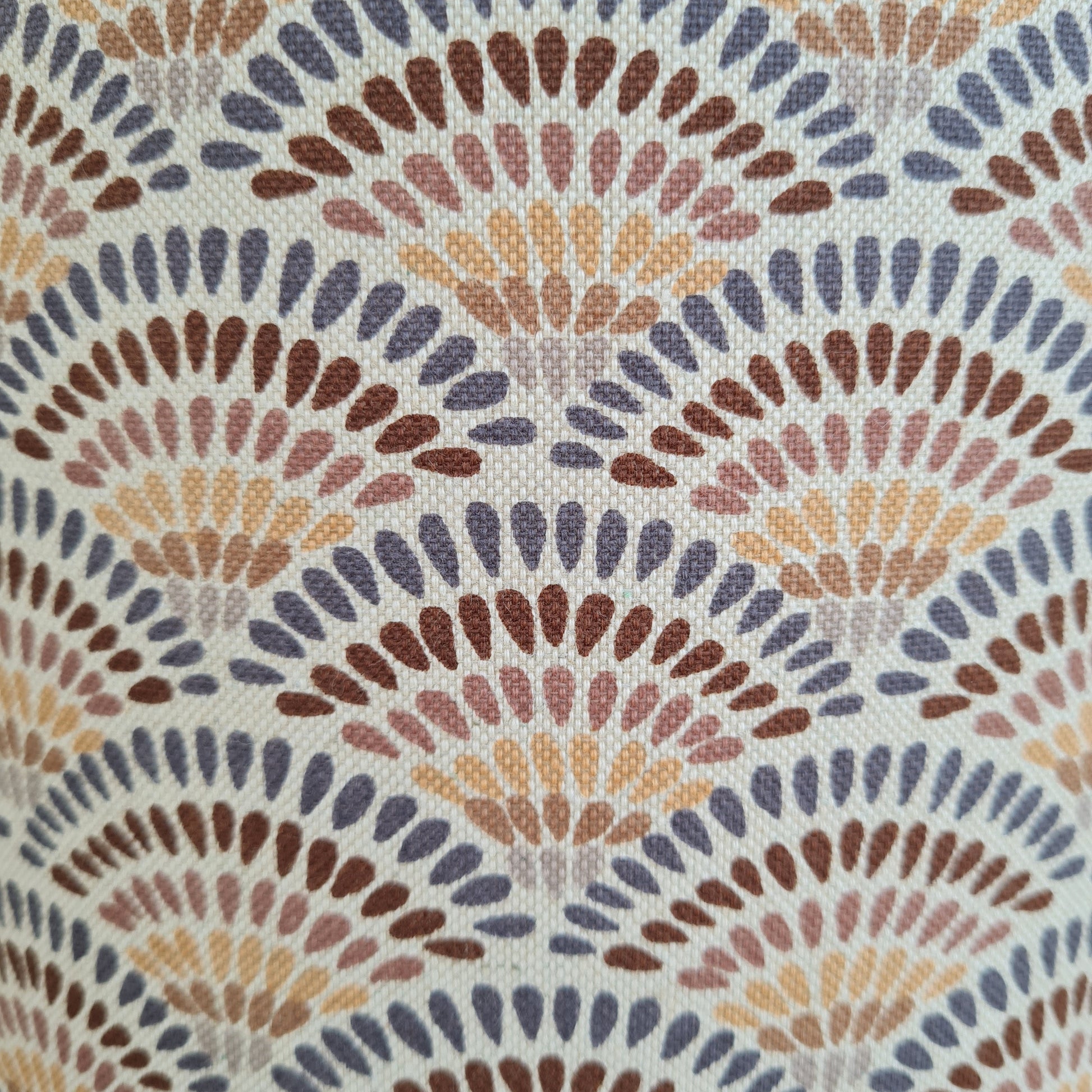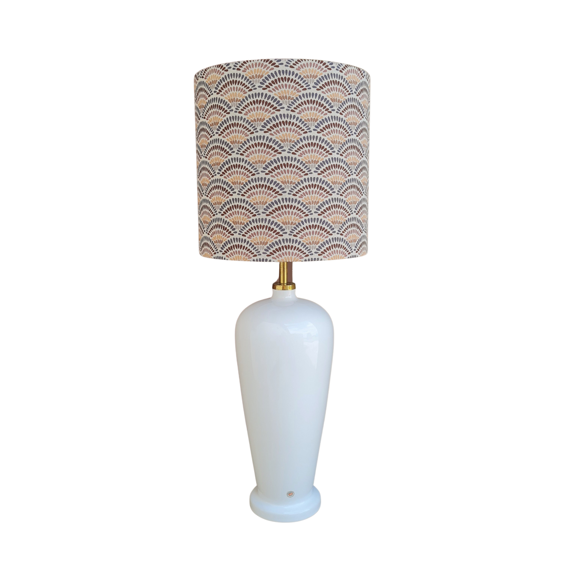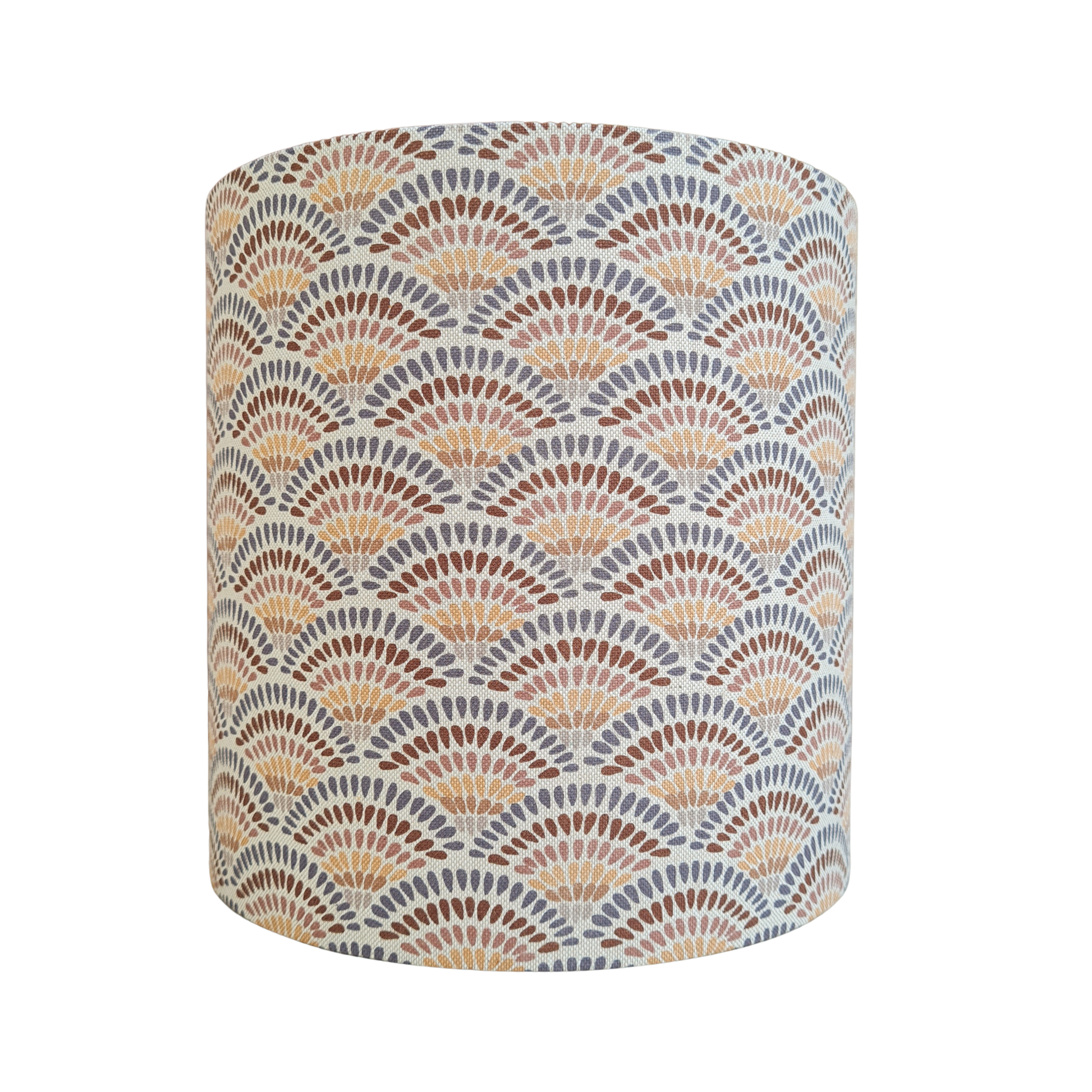 Håndlavet lampeskærm i bomuld med et flot grafisk mønster i varme toner af brun, gylden og grå