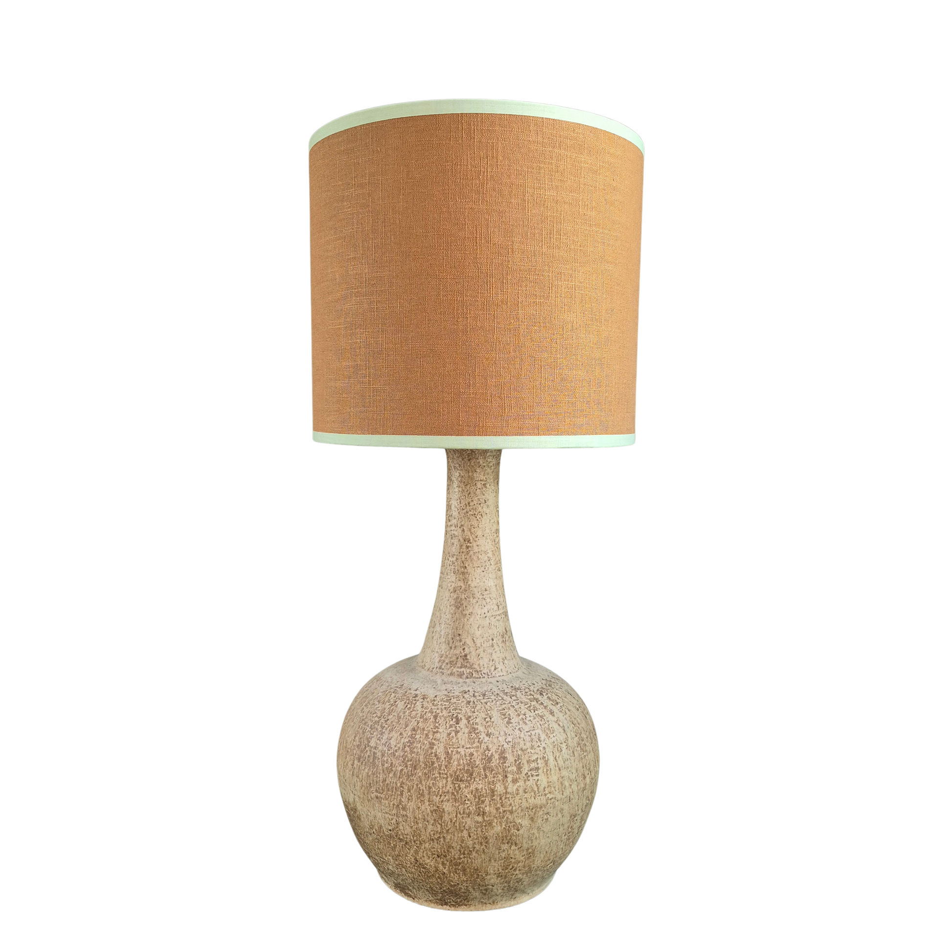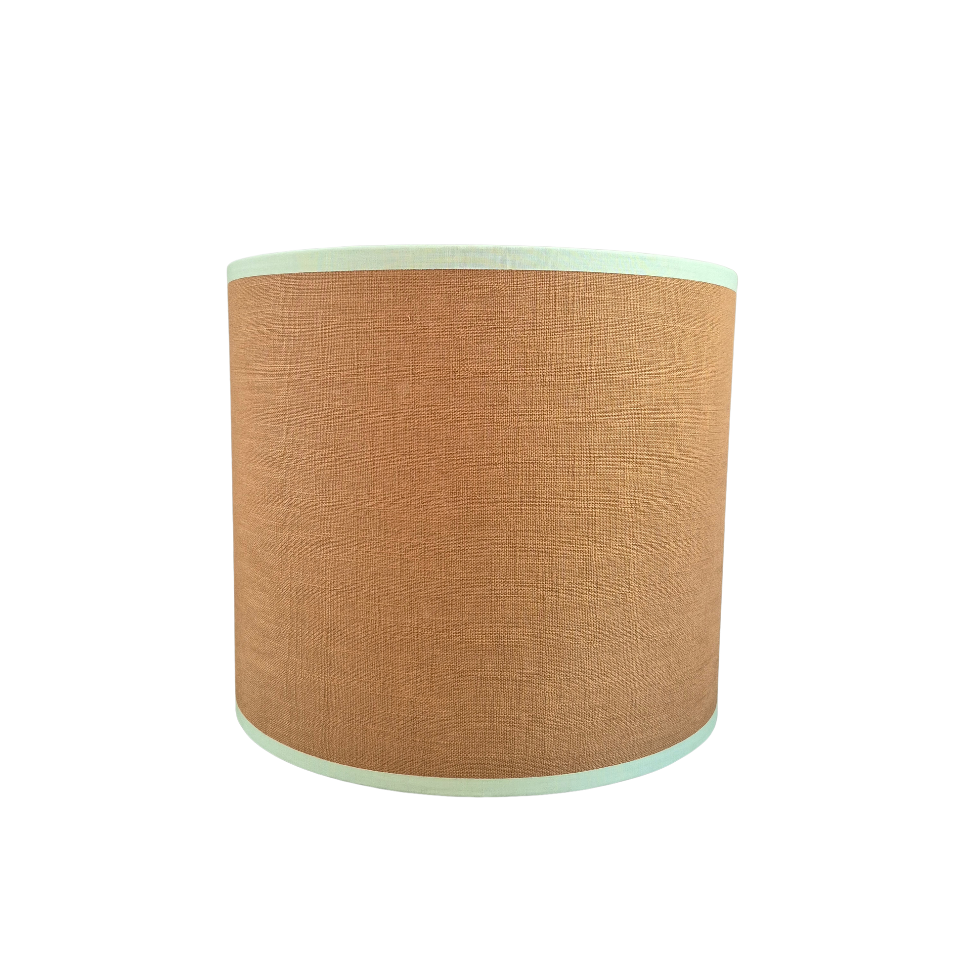 Denne smukke lampeskærm er håndlavet i fin kanel farvet hør og er afsluttet med en eksklusiv detalje af fint kantbånd i mintgrøn