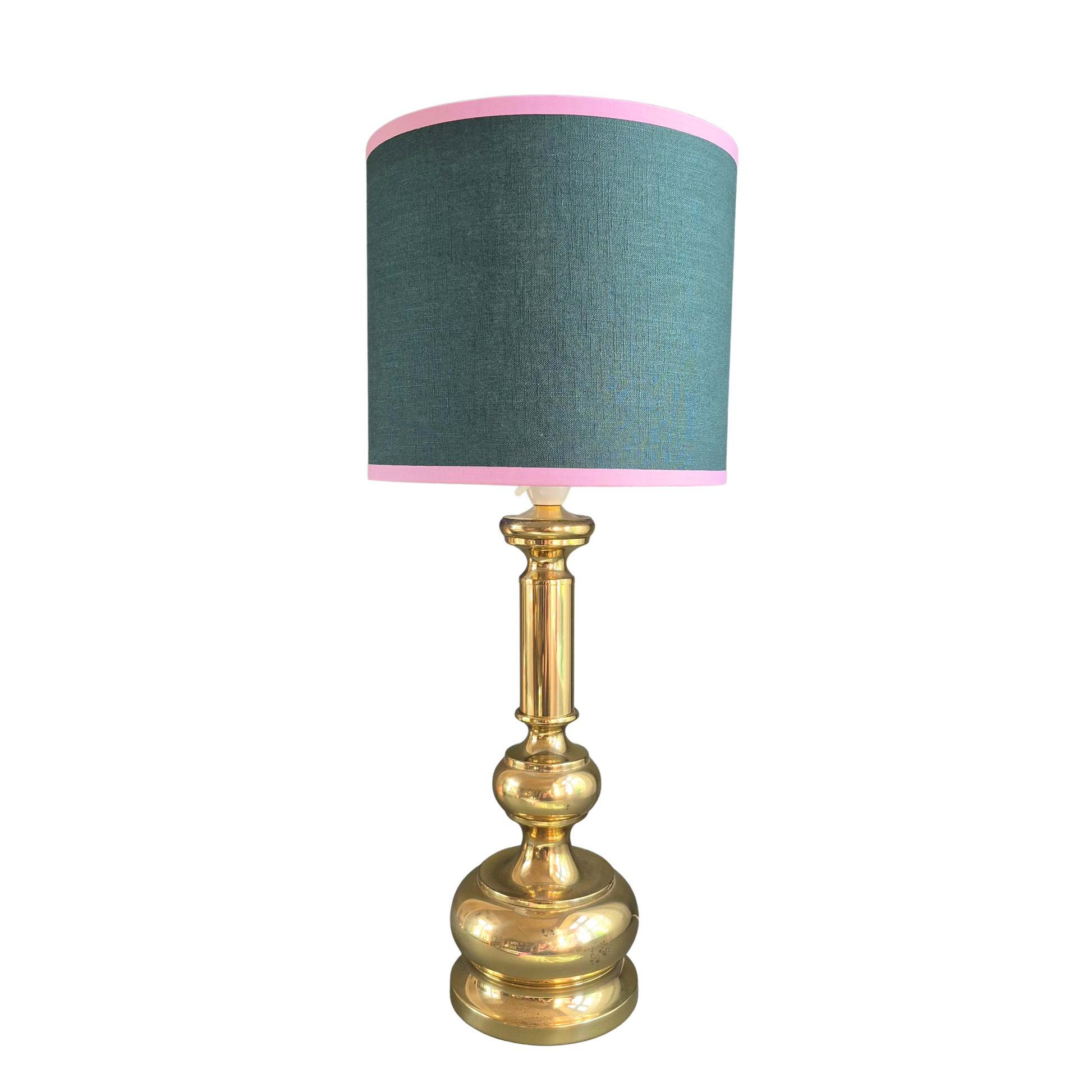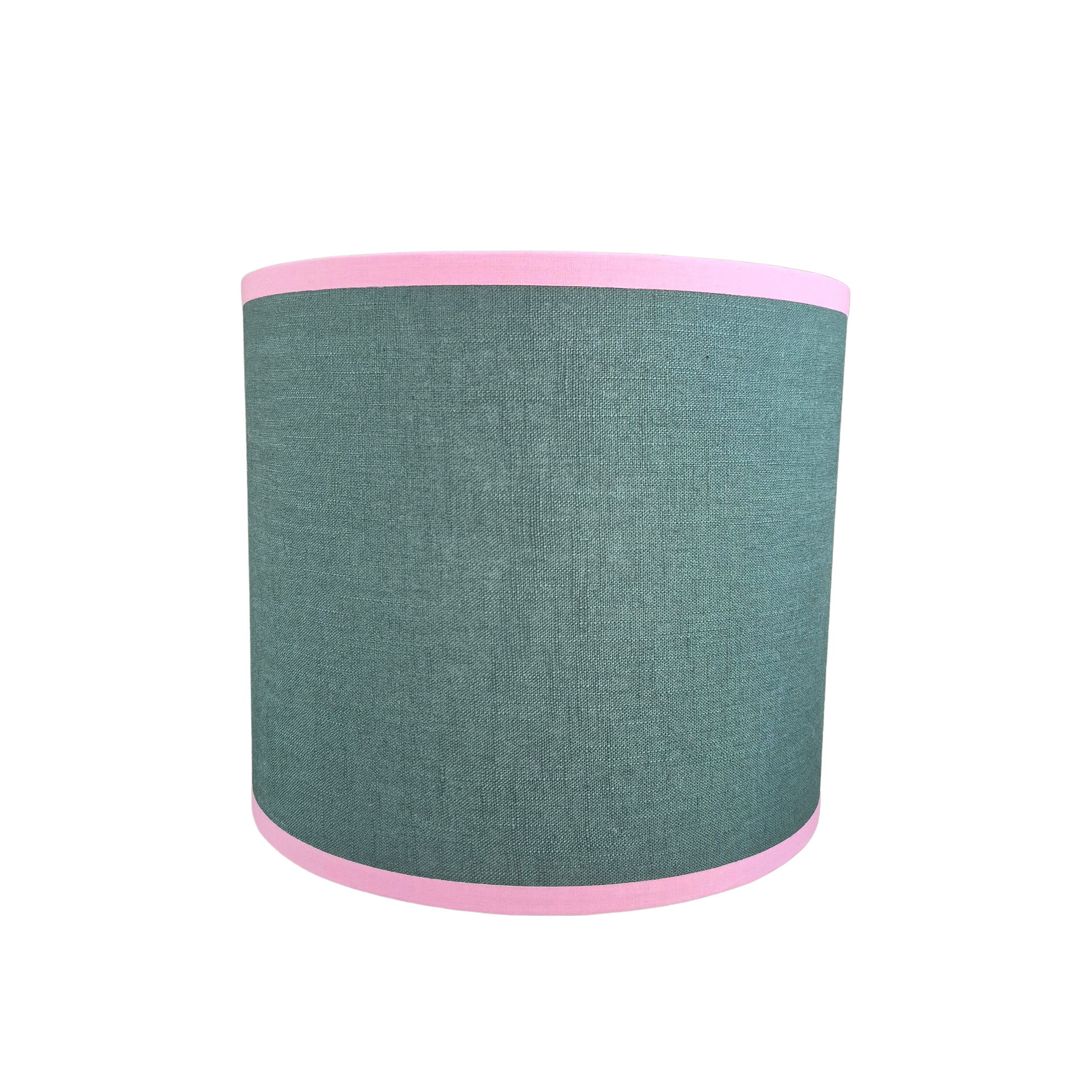 Denne smukke lampeskærm er håndlavet i fin petroleums farvet hør og er afsluttet med en eksklusiv detalje af fint kantbånd i lyserød