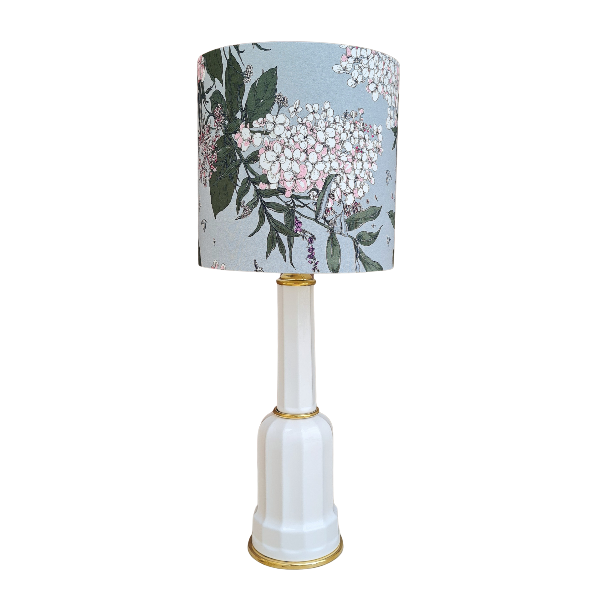 Håndlavet lampeskærm i bomuld med mønster af smukke hortensiaer på grå bagrund og fine mørkegrønne blade