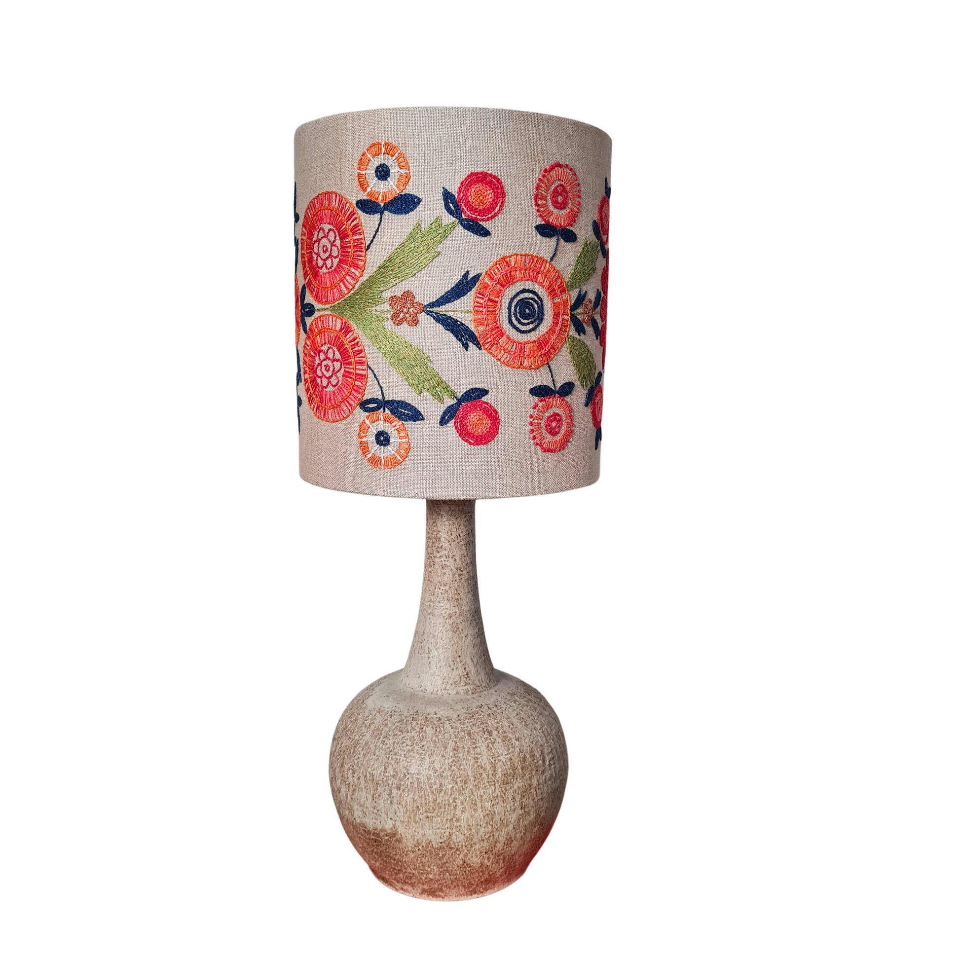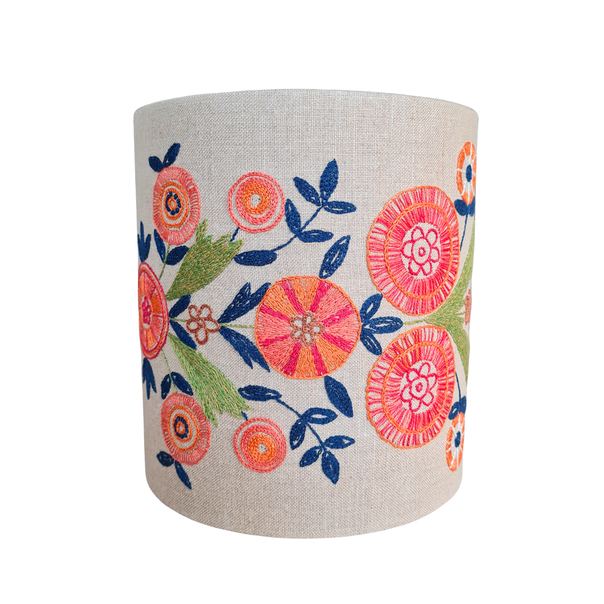 Denne smukke lampeskærm er håndlavet af et svensk vintage broderi Håndbroderet på naturfarvet hør med smukke klare farver