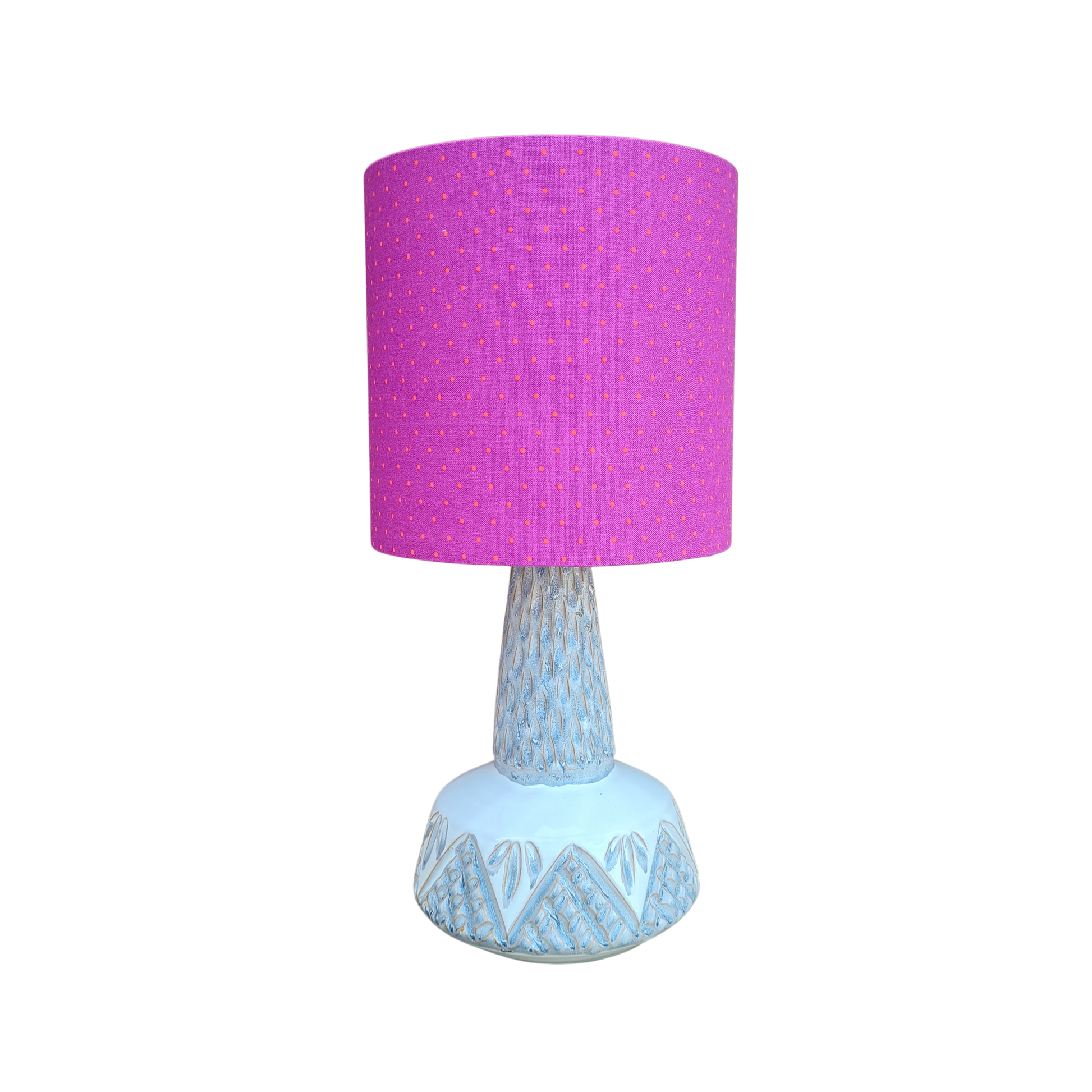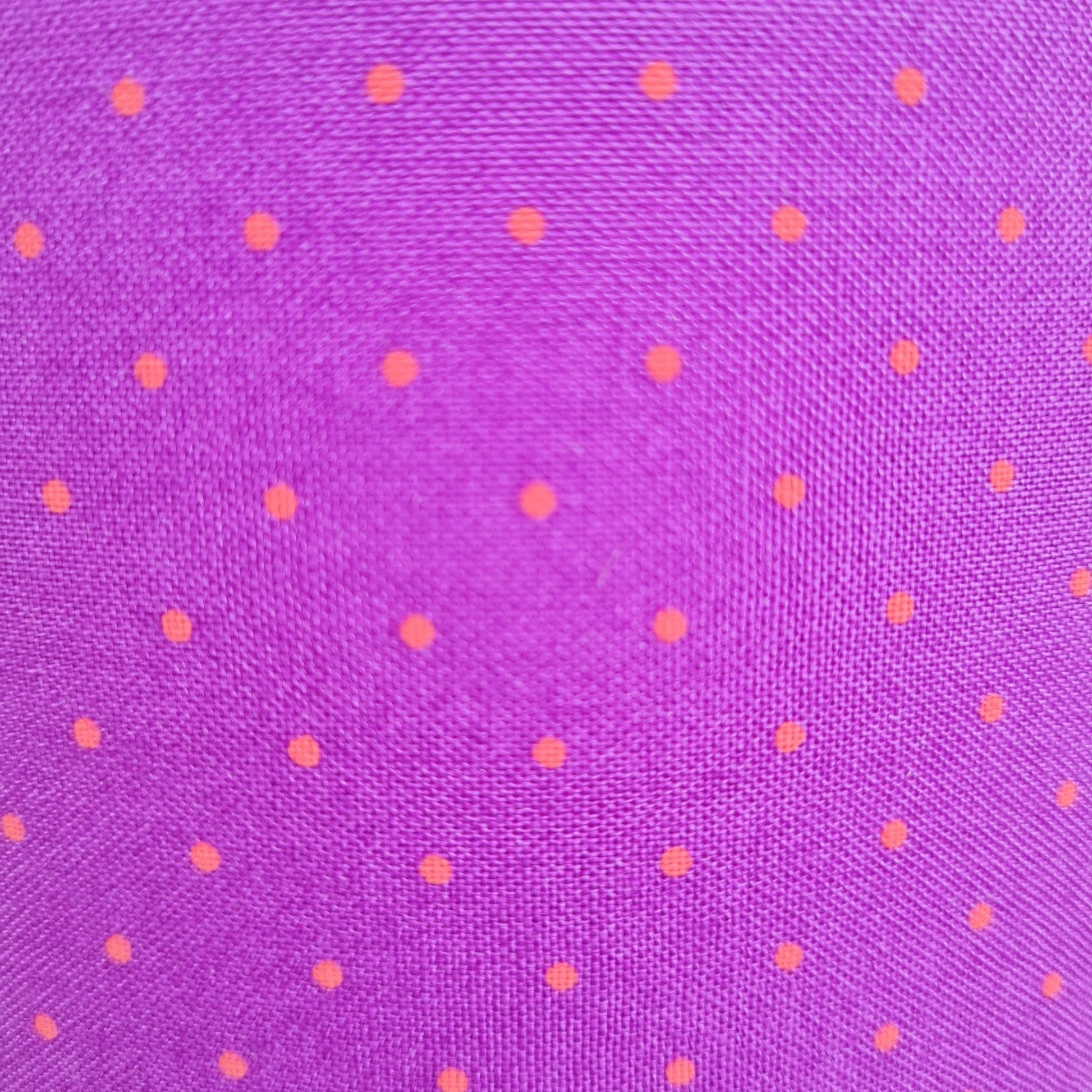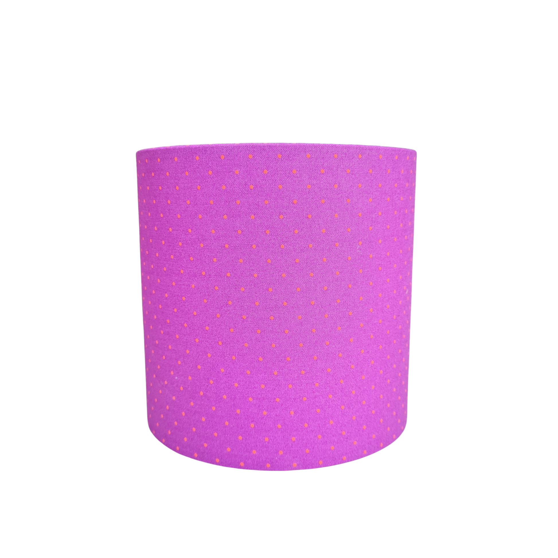 Håndlavet lampeskærm i bomuld med bund i flot kraftig lilla og små prikker i orange