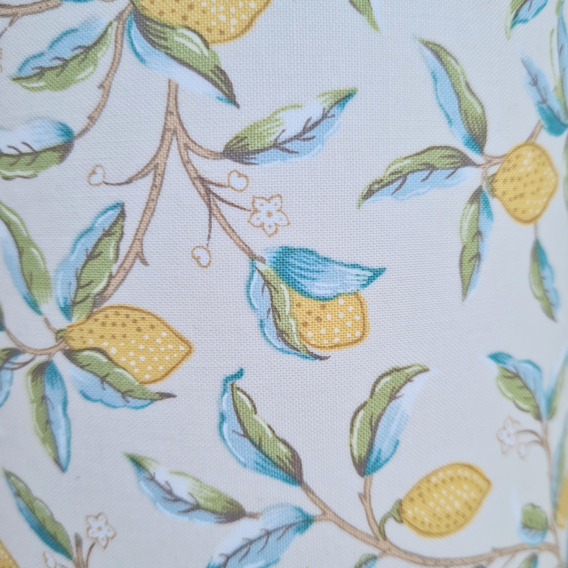 Håndlavet lampeskærm i bomuld med William Morris design Lemon, lys baggrund med smukke gule citroner og grønne blade
