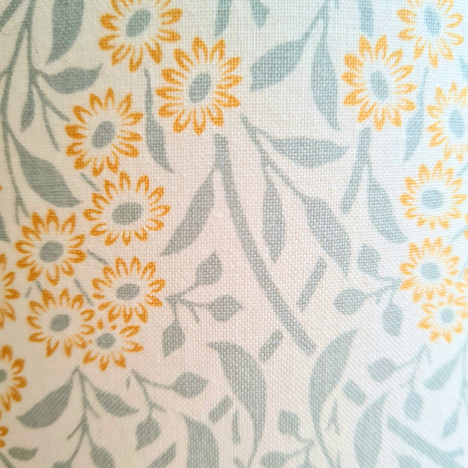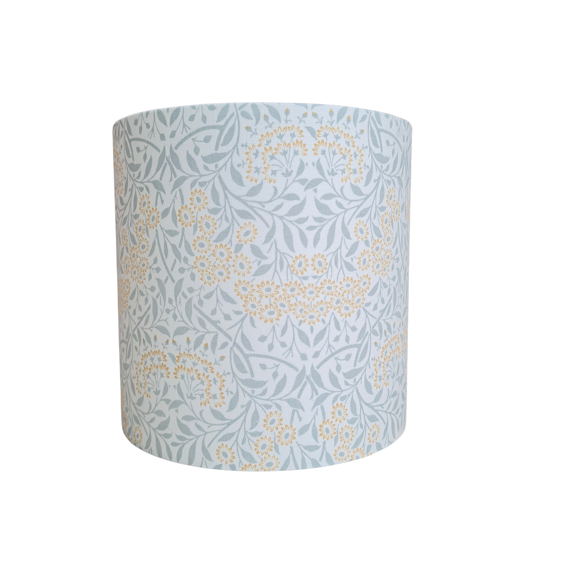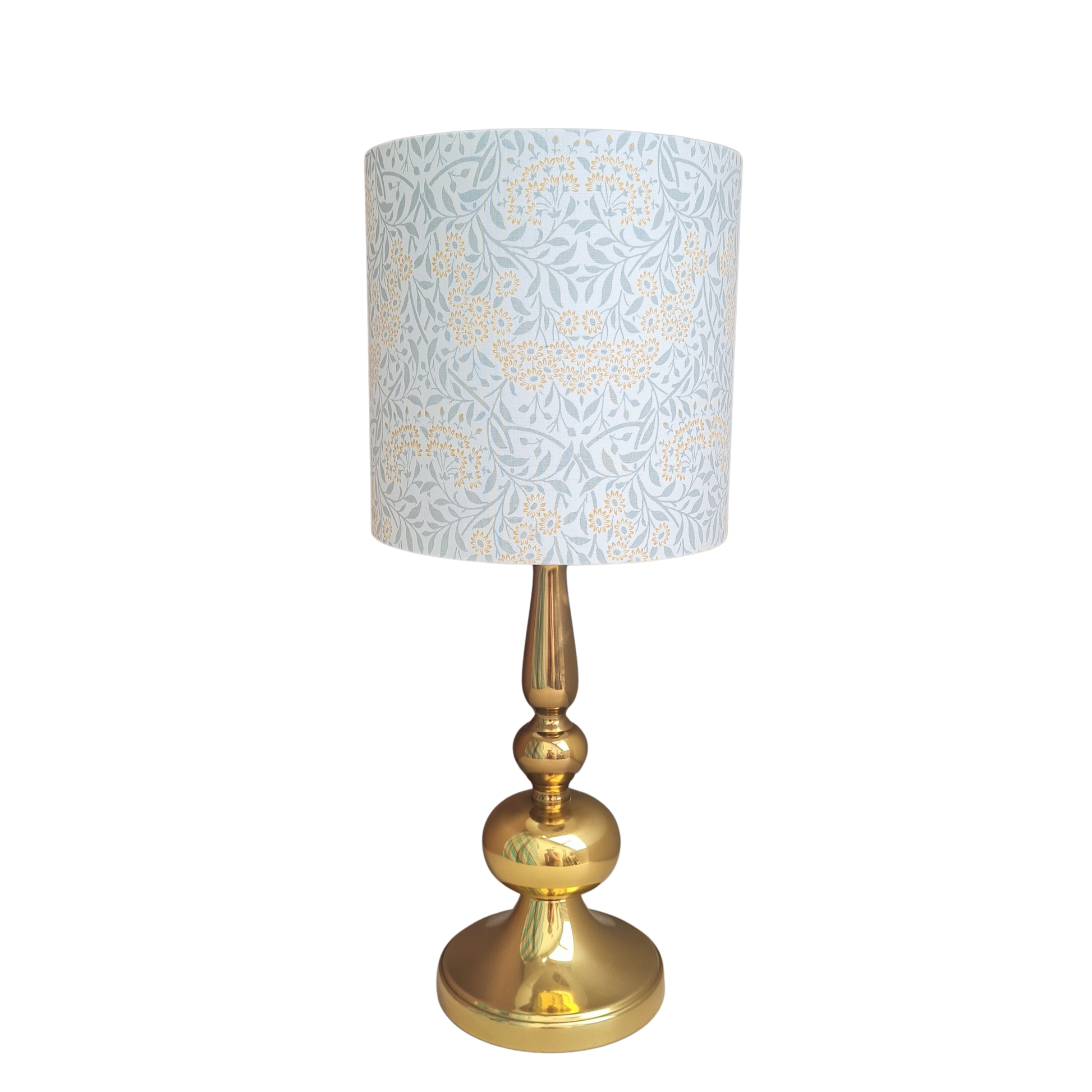 Håndlavet lampeskærm i William Morris design med smukke blomster og slyngende grene i toner af lysegråblå og gylden på elfenbensfarvet baggrund