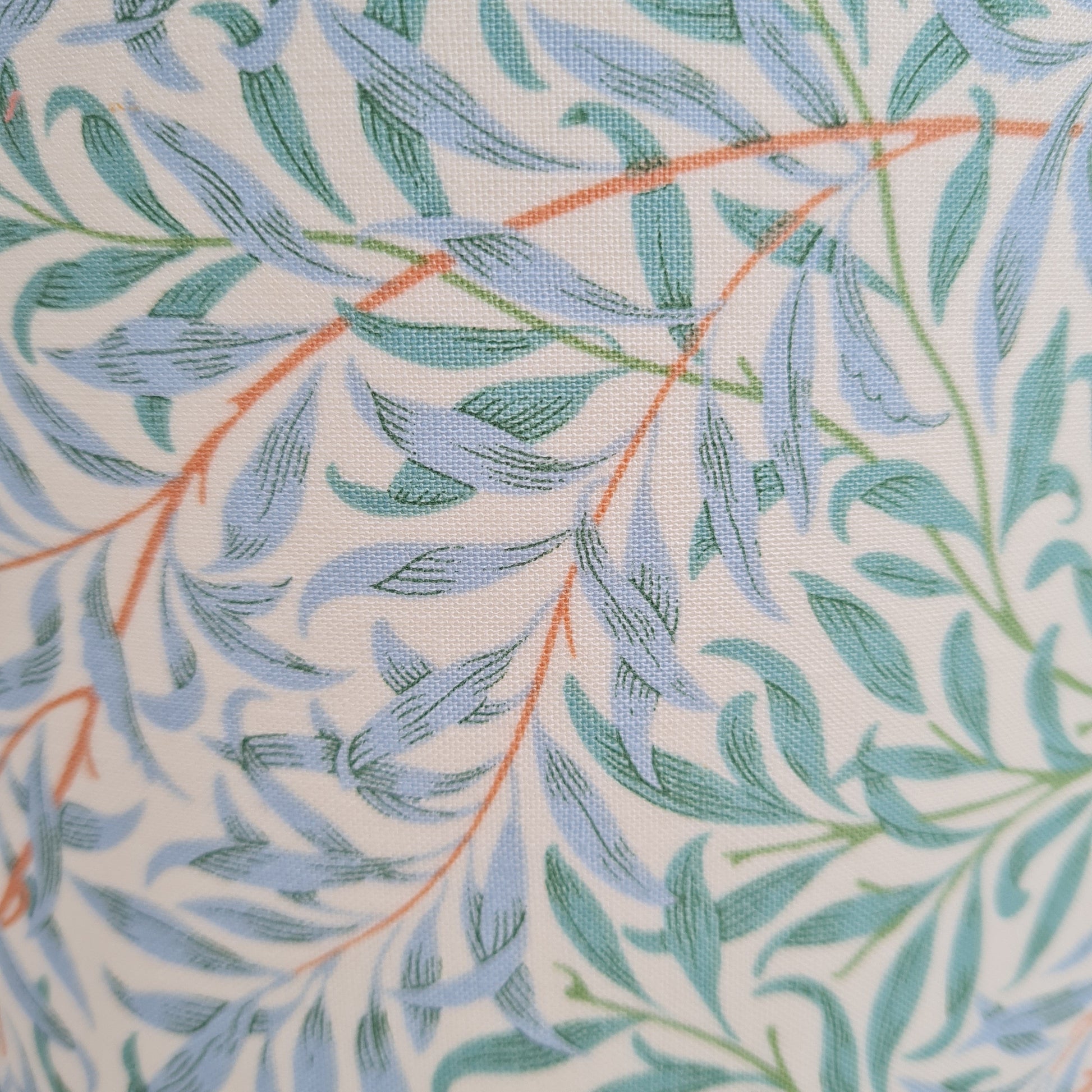 Håndlavet lampeskærm med blade i grønne og blålige nuancer og fine grene i en mørk orange